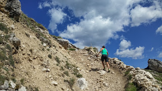 Decido di continuare a tenere un passo di corsa, se così si può chiamare, fin dove riesco. Il procedere è reso difficoltoso dal fondo molto irregolare e a tratti pietroso oltre che dal fatto che poco alla volta recuperiamo tutti i camminatori anche oggi come di consueto partiti una mezz'ora prima di noi.
